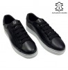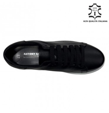 Sneakers di colore nero realizzate in vera pelle con suola bianca in gomma antiscivolo, punta tonda, fodera interna in morbida pelle, soletta ammortizzante ed estraibile.